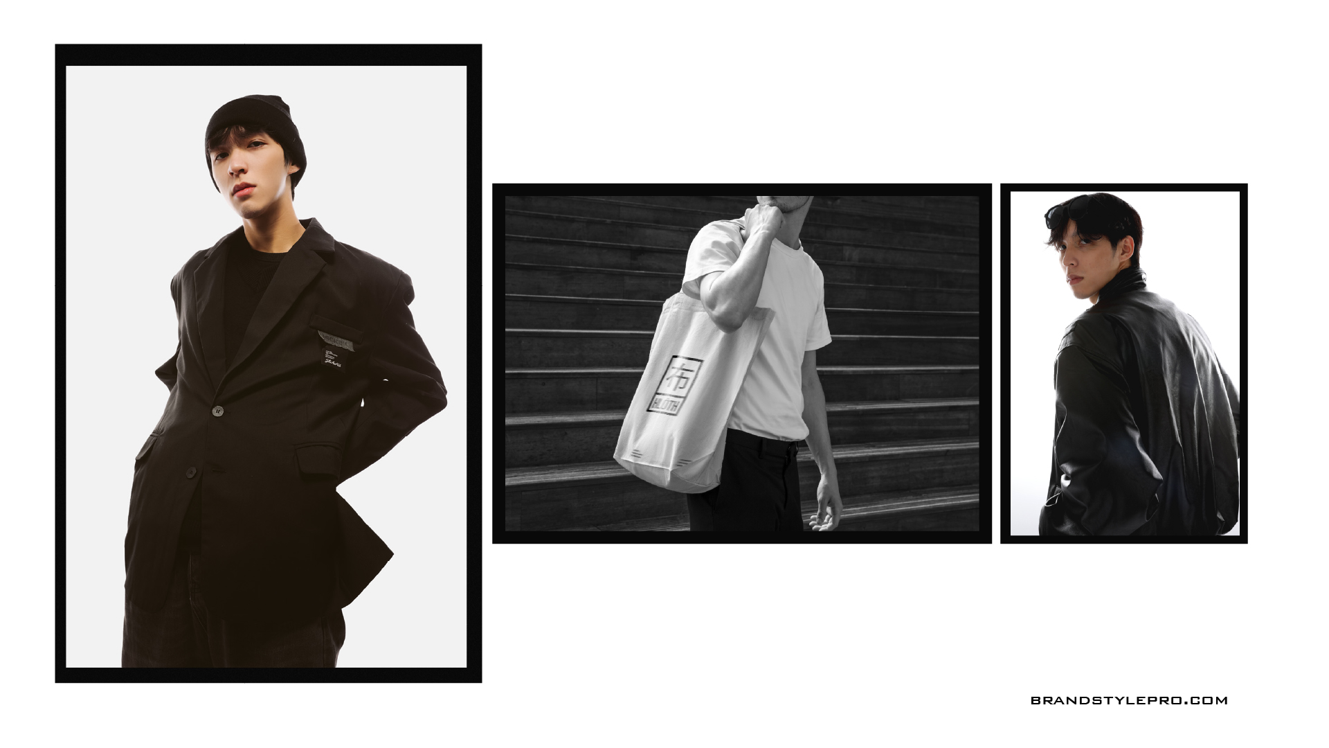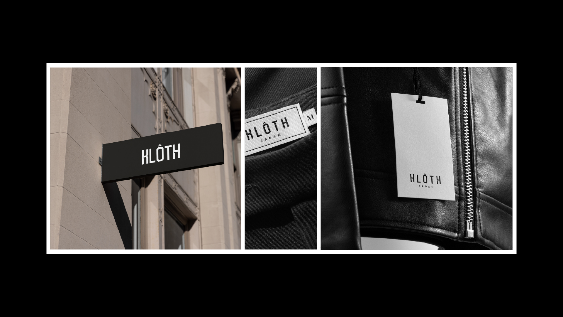 Packaging for KLÔTH follows the monochrome philosophy as well. Shopping bags, clothing tags, care labels, and packaging boxes all use black surfaces with white logo markings. The simple combination creates an elegant unboxing experience, making the brand feel premium without over-designing.